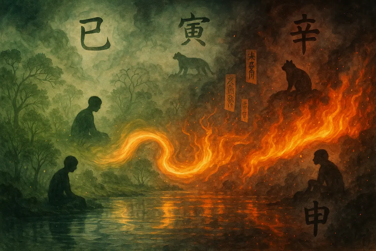 Люди, родившиеся в годы 寅 или 申, могут столкнуться с повышенной эмоциональностью, так как эти ветви формируют с ветвью года 巳 огненное наказание. Это взаимодействие провоцирует импульсивность и чрезмерную эмоциональность. Потерять самообладание станет проще, а импульсивность будет приводить к более опасным последствиям. Ярость, переходящая в хаотичные действия, может привести к невнимательности, а затем — к мелким травмам или даже серьёзным происшествиям.