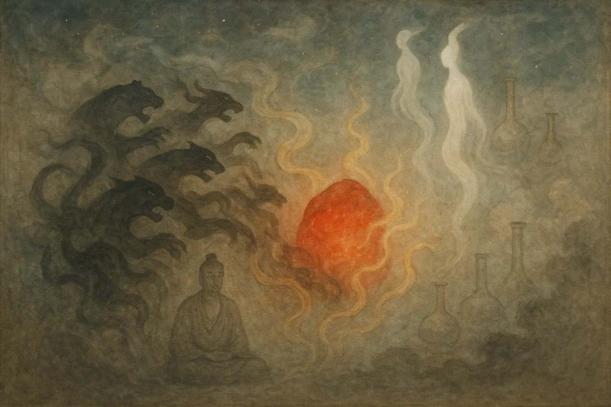 Тут дело в том, что концепция перерождений, что, мол, все существа обладают вечным духом, проходящим бесчисленные перерождения, пока не выйдет за пределы сансары — это буддийская идея, которая изначально не была присуща даосскому видению экзистенции. Даосы считали, что человек помимо тела имеет 10 «душ»: семь земных и три небесных. Три «небесных души» — это наши идеальные благородные божественные устремления, а семь «земных душ» — это наши низменные, телесные, животные мотивы. Это боги и демоны, ангелы и черти, живущие в нас. Это что-то знакомое, правда?