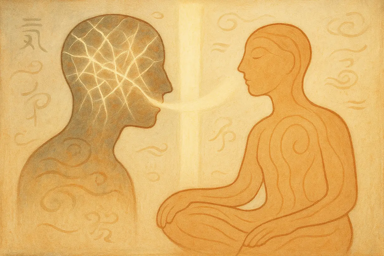 Чжуан-цзы говорит, что такие попытки не приведут успеху. Он предлагает нам выправить себя. Выправить себя — это не делать перекосов ни в сознание, ни в тело. Занять центральную позицию, переместить внимание в дыхание — потому что дыхание является одновременно и физиологически автономным процессом, и подвластно контролю сознания. Когда внимание якорится на дыхании, и когда мы ненарочито способствуем тому, чтобы дыхание становилось медленным, плавным, глубоким, затрагивающим все клеточки тела, мягко переходящим из выдоха во вдох без резких переключений, то мы формируем в себе новый центр самосознания, который централен по отношению к быстрому сознанию и медленному телу.