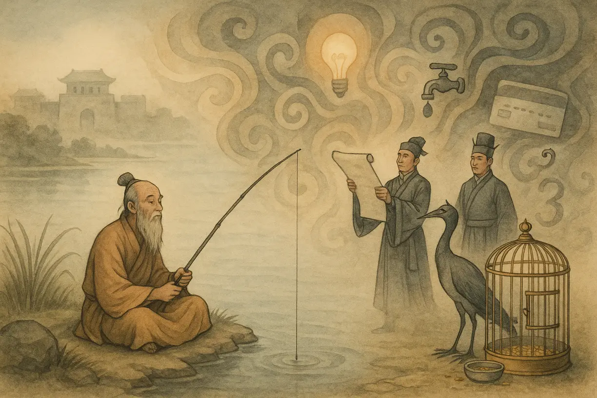 Чжуан-цзы удил рыбу в реке Пушуй, а правитель Чу прислал к нему двух своих сановников с посланием, и в том послании говорилось: «Желаю возложить на Вас бремя государственных дел».