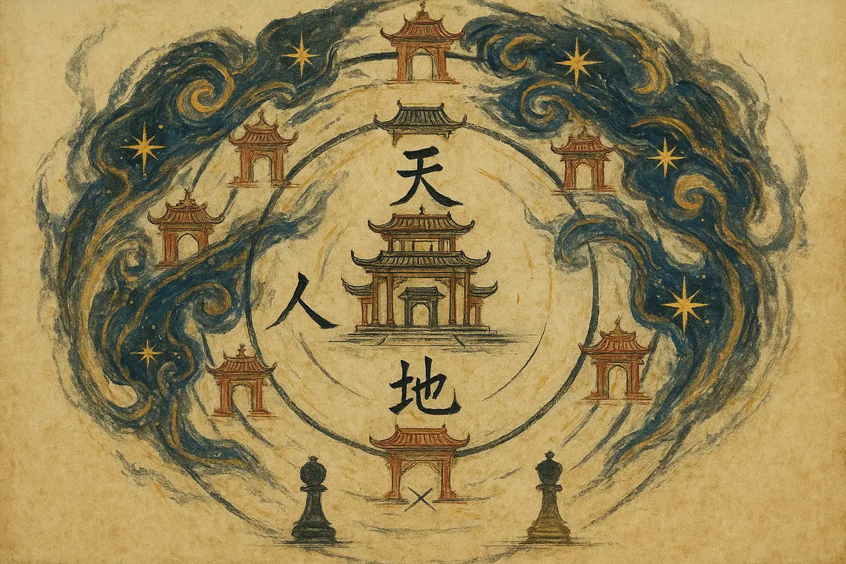 Еще один аспект аналитичности этой системы — лежащие в её основании классические даосские представления о космологии. Сознание, виденье, ум влияет на поведение человека. Совершённые действия формируют его будущую реальность. Сформировавшаяся реальность формирует новые системы взглядов в уме. Умение бегло соотносить операнды Цимэнь с одним из трёх космологических уровней и их отношениями даёт существенную фору практикующему. Три уровня: Небо (сознание, дух), Человек (действия, активности), Земля (реальность, обстоятельства).