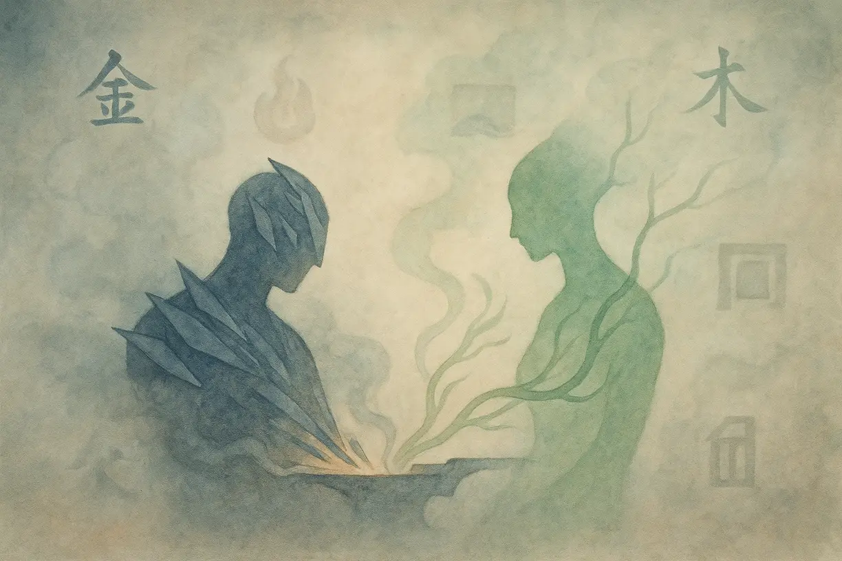 Но на уровне более тонких десятеричных корреляций Гэн (металл-ян) и И (дерево-инь) находятся в отношении слияния. Несмотря на напряжение преодолевания, эти два знака тянутся друг к другу, сливаются, объединяются в результирующую стихию. Результат слияния Гэн и И — это Металл (просто, без инь/ян, одна из пяти базовых стихий).