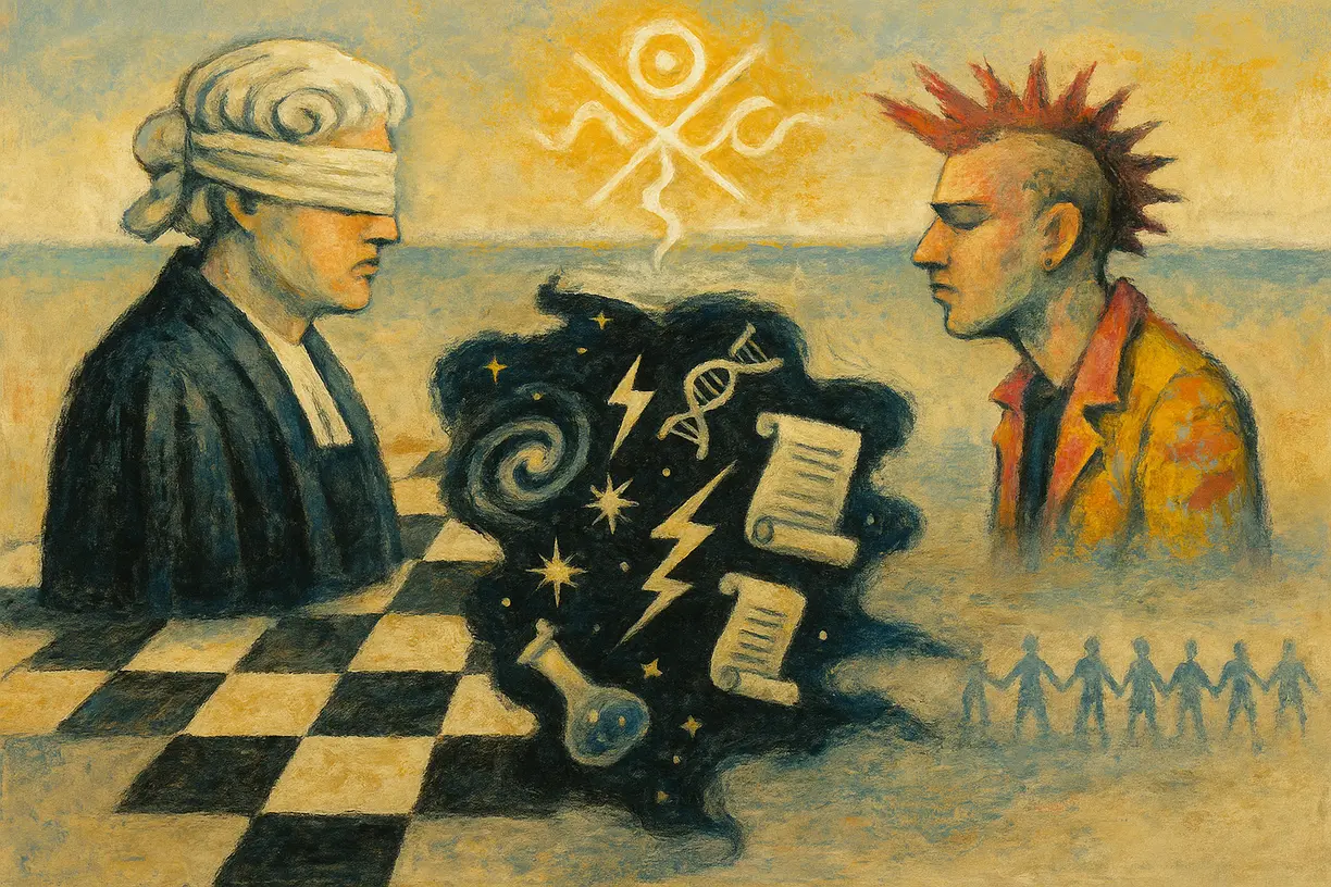 Относиться к закону, придуманному людьми, как к вселенским принципам, как к залогу божественной гармонии — это чуть ли не святотатство. И когда люди склонны превозносить закон на неподобающую ему ступень священности, то обязательно найдутся и те, кто будет обходиться с законом пренебрежительно. Это реакция. Чем драматичнее мы в благоговении закатываем глаза по поводу собственных придумок, тем скорее найдутся панки, которые честно нам покажут, что это фарс.